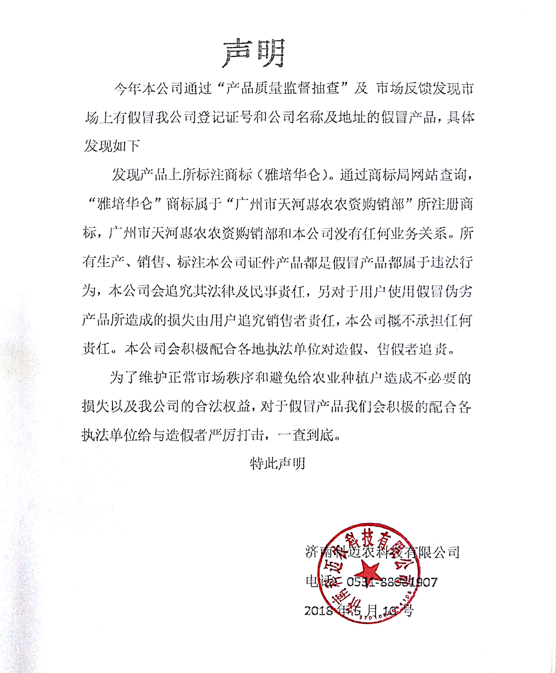 為了維護(hù)正常市場(chǎng)秩序和避免給農(nóng)業(yè)種植戶造成不必要的損失以及我公司的合法權(quán)益,對(duì)于假冒產(chǎn)品我們會(huì)積極的配合各地執(zhí)法單位給予造假者嚴(yán)厲打擊,一查到底。